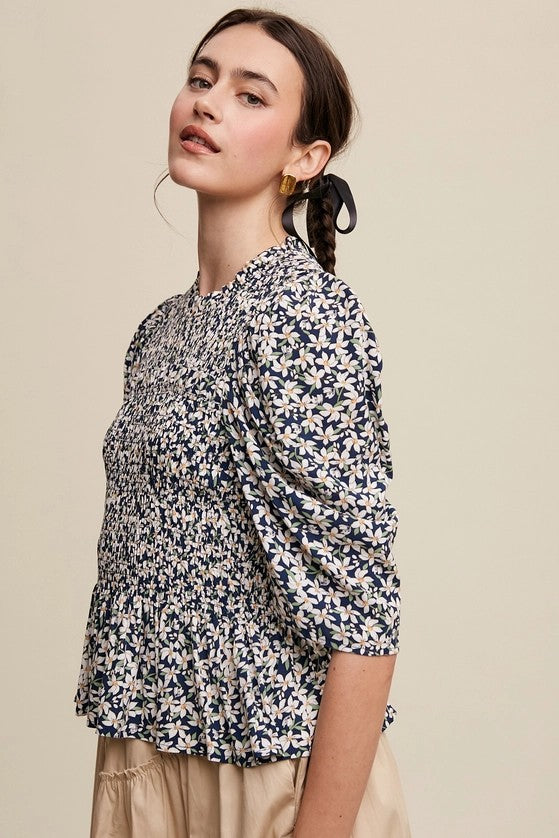Romantica blusa floreale blu notte, con maniche a sbuffo arricciate.