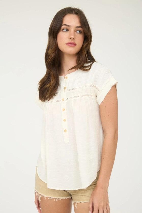 Top colore avorio a maniche corte con dettaglio ricamato e bottoni